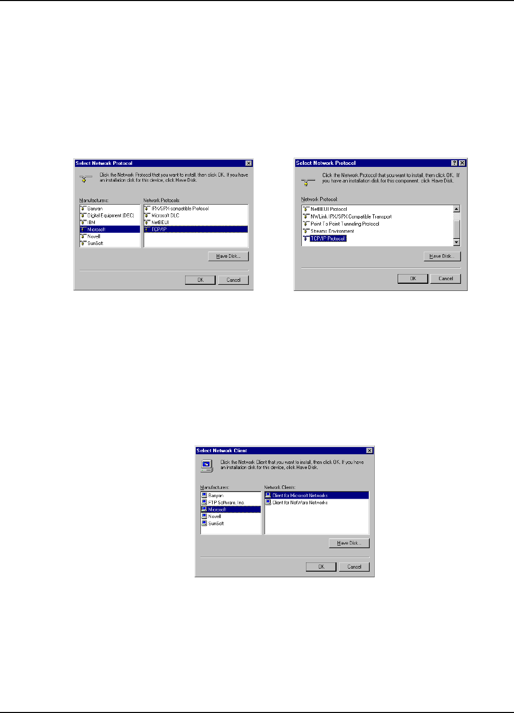 3. The Select Network Protocol dialog box is displayed. In the Manufacturers option box [Win95