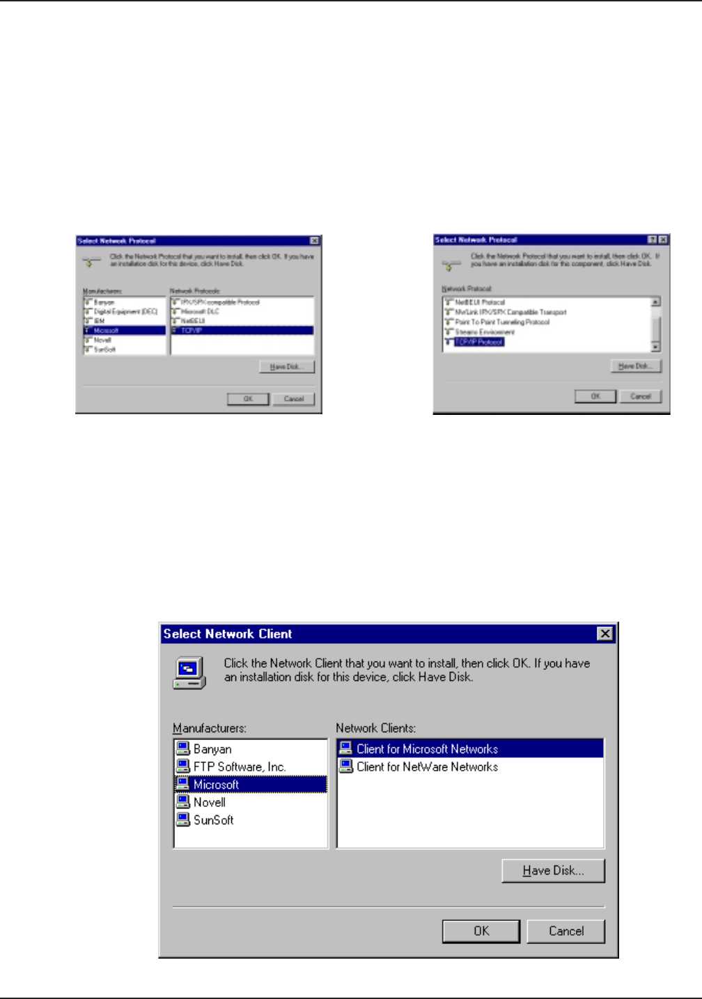 [Win95 only], select Microsoft. In the Network Protocols list, select TCP/IP