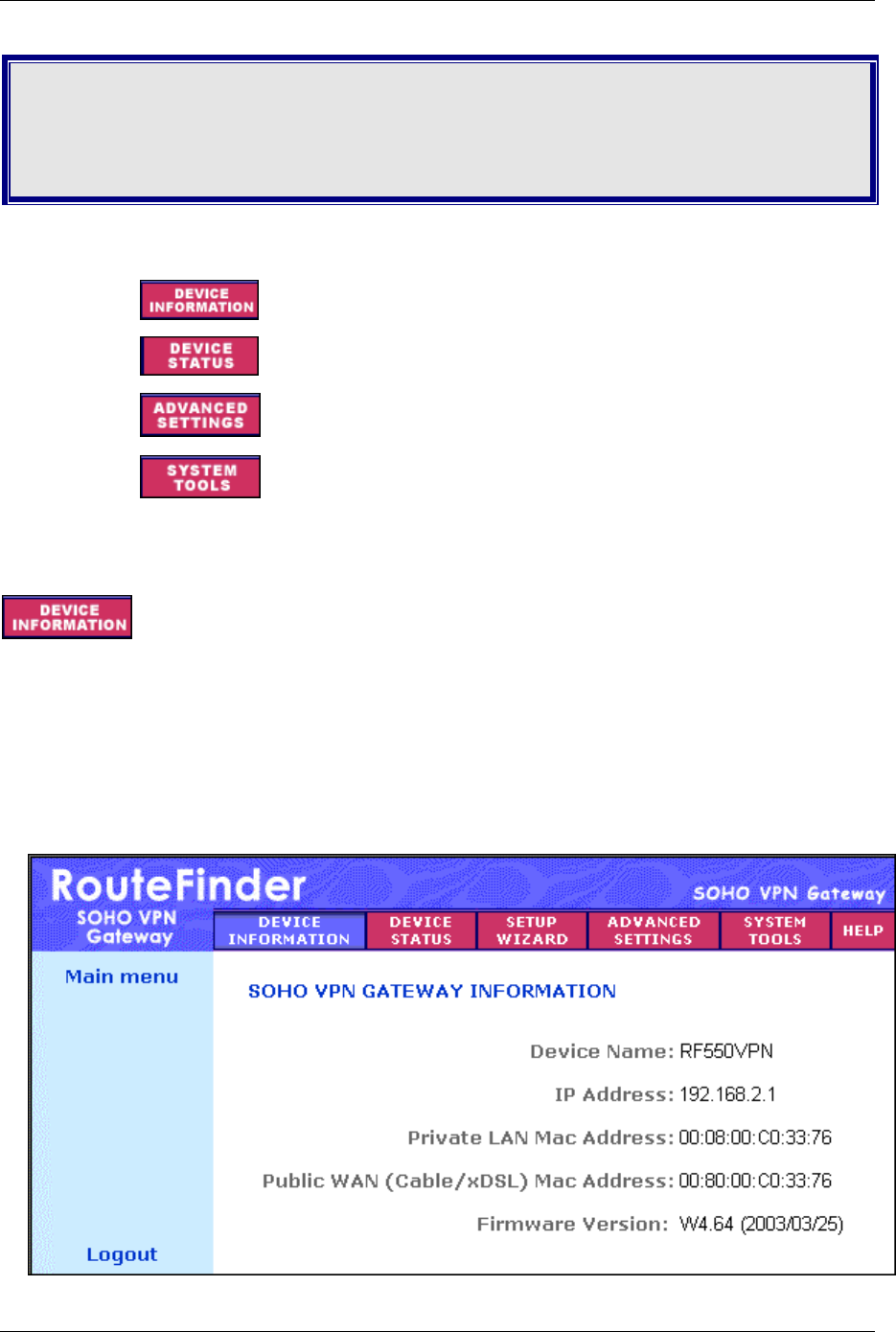 Once the RF550VPN has been configured using the Setup Wizard, the other menu options can be